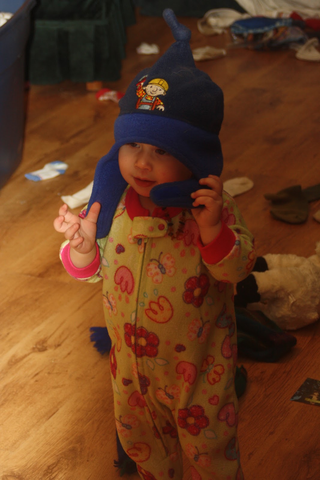 I know not the best picture and please dont’ mind the socks and stuffed animals on the floor, lol, the big kids were cleaning up their mess. So sweet girl is taking her hat off when big brother decides he needs to ham it up, after all he is the cause of her getting her picture taken.
