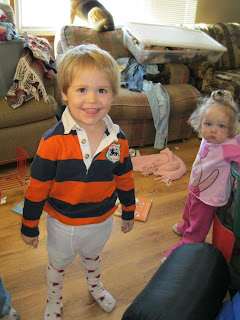 My youngest son decided to wear his sisters tights while I was gone. Forgive the mess in the background, not sure what they did while I was gone but they had fun.