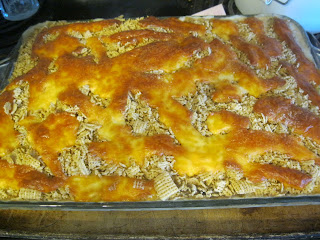 Layer the ingredients as written into a 9 by 13 casserole dish. Pour melted oleo over top. ( you will note that I put the cereal down, then the cheese, I placed the butter ontop of the cereal but under the cheese) Bake 35-40 minutes in 350 degree oven or until lightly browned.