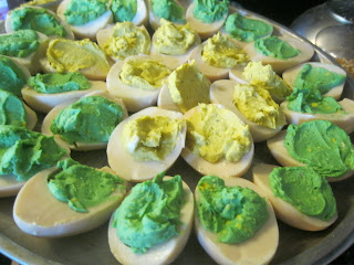 Yummy Deviled Eggs with some turquoise gel paste food coloring from Primp My Cupcake added a nice touch.