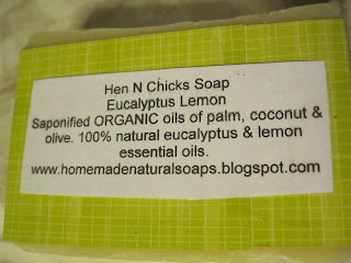 Hen N Chicks Soap. I was given the Eucalyptus Lemon to try. On the label it states “saponified Organic Oils of palm, coconut, and olive. 100% natural eucalyptus and lemon oils.” It smells heavenly. When I opened the box I was immediately met with the wonderful herb smell of eucalyptus with a hint of lemon. It reminds me of a tea my grandma used to make.