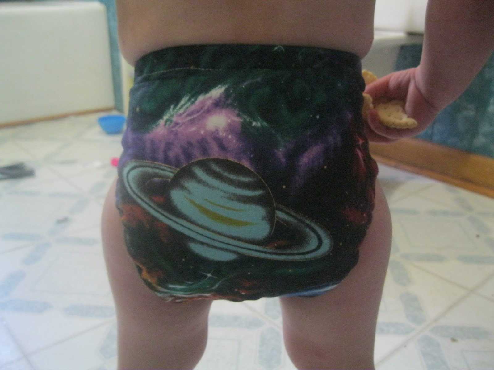 When I was approached by a fan on facebook about reviewing one of her cloth diapers, I was ecstatic! I mean who doesn’t like a free cloth diaper! And then it arrived. Oh my can we say cute! I had asked for a gender neutral print because almost all of the ones we have are girly. This diaper uses snaps(which I prefer to aplix) and is a pocket. Now, I do love my fitteds for Fionna, but Zyera does great with pockets so this one went to her. Along with the pocket diaper came two inserts. One large and one small. Here is how I used it. For daytime use I would stuff the pocket with the large insert. For night time use I would stuff with the large and then place the small on top of the cover so it was next to baby. At night time I also added a fleece cover as it is not waterproof. During the day I forgot the fleece and she did wet through, but not soaked so it wasn’t a problem.