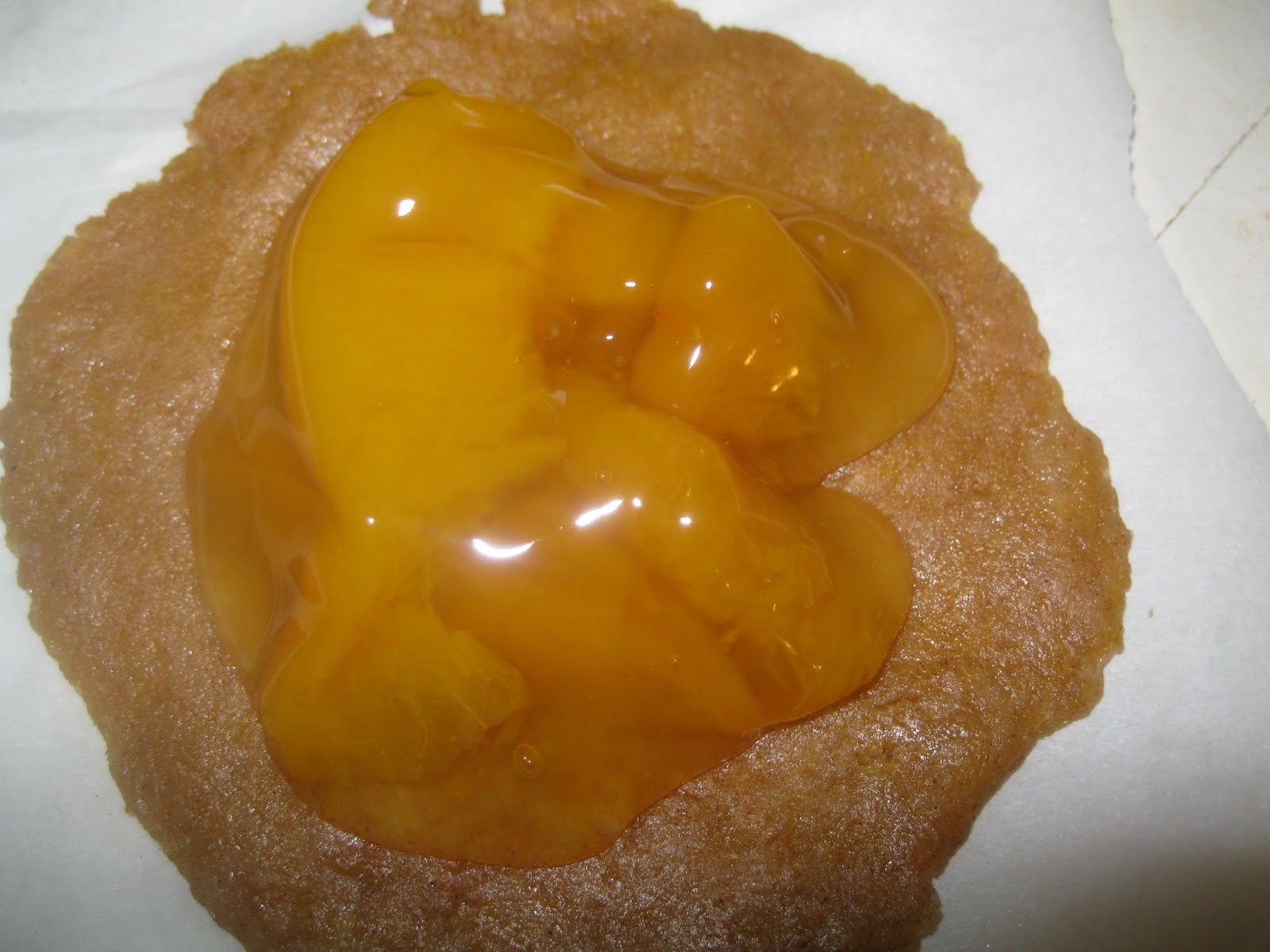 Place one circle on a cookie sheet(sprayed with olive oil) and top with a large Tb of peach pie filling.