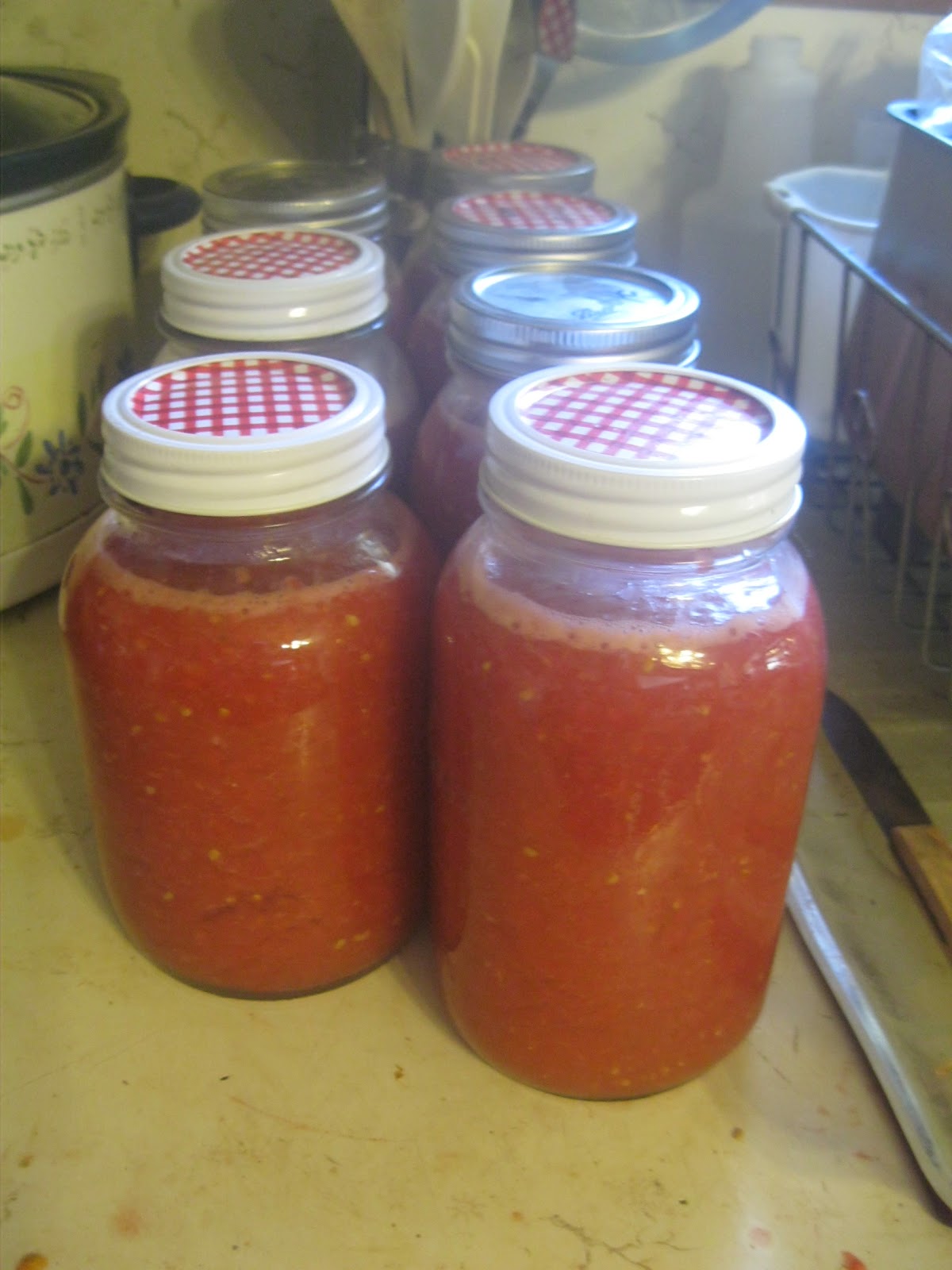 And you’re done! You can put in jars(I fill quart jars 2/3 full) and freeze or can these. Then when I need to make spaghetti sauce or ketchup or salsa I just take out a jar, thaw it, and I’m ready to go!