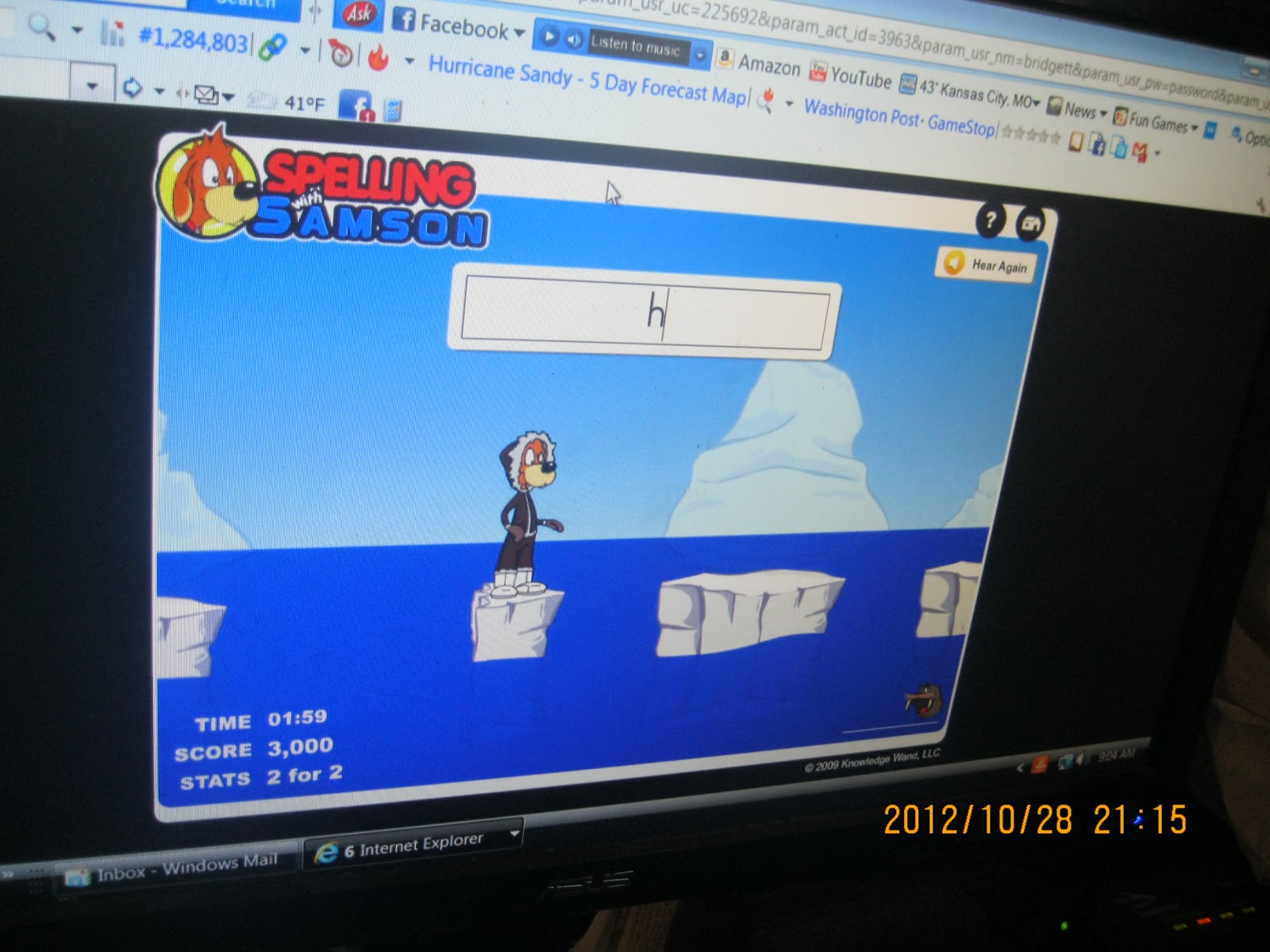 | Bridgett pecking out her spelling words. |
