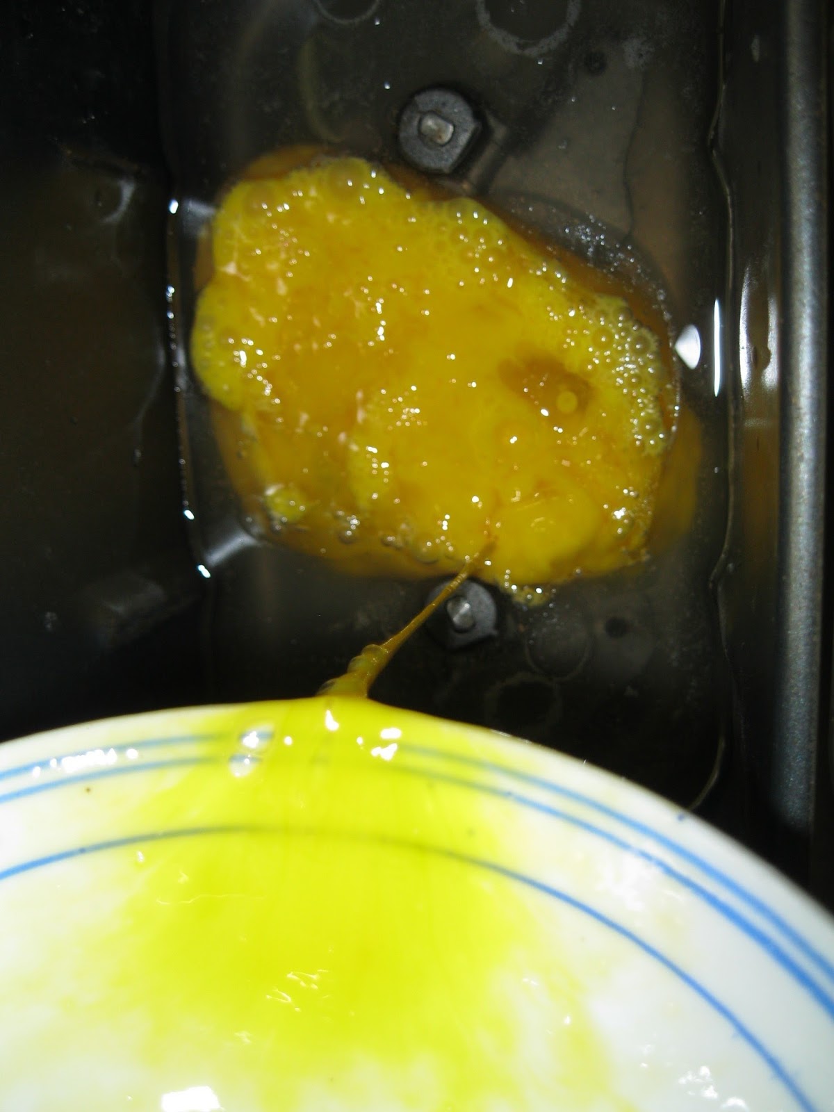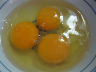Crack the eggs, scramble them up, and add them into the bread machine pan.
