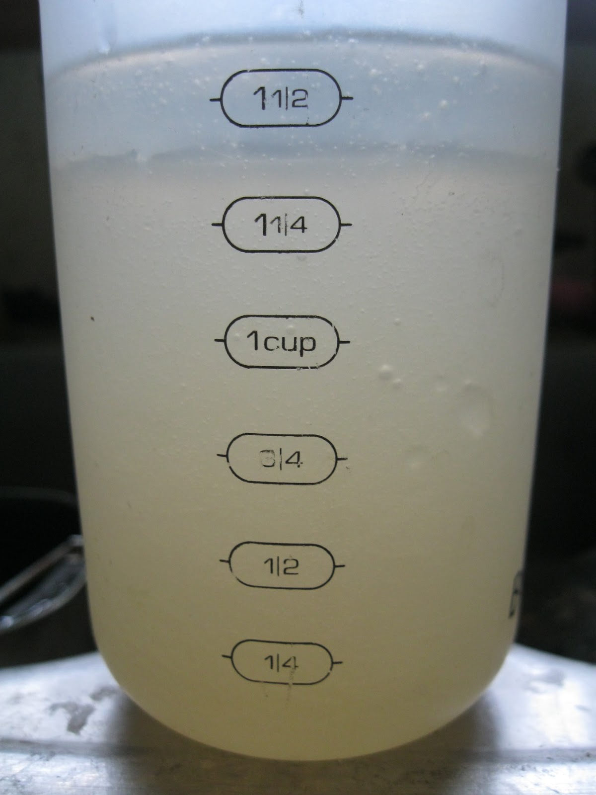 Measure out the 1-1/4 cup hot water, add 1/4 cup olive oil, and 1 tsp apple cider vinegar.